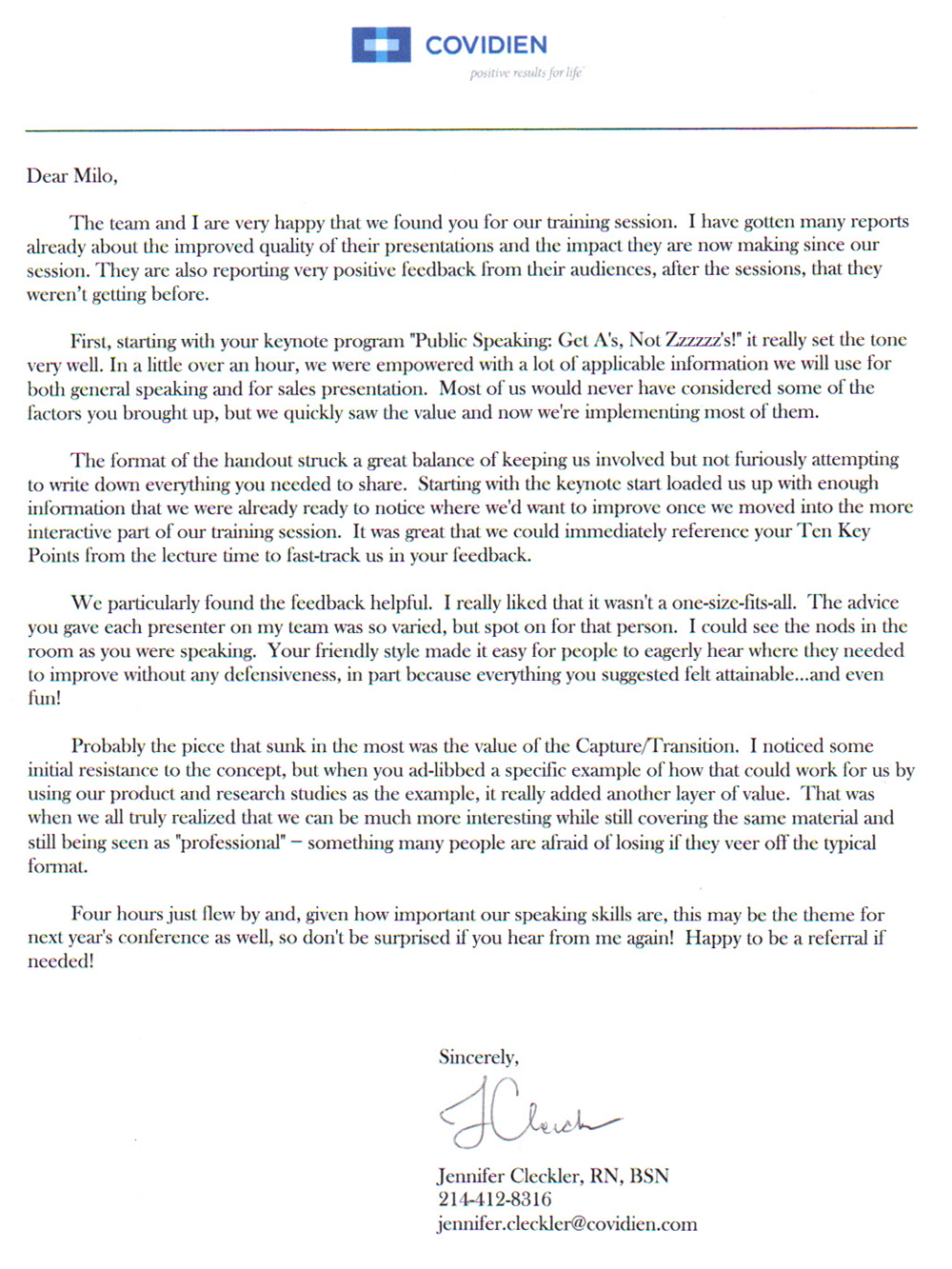 Covidien (makers of medical devices, like the blood pressure finger clip) Jennifer Clecker, Clinical Manager for Patient Monitoring, leader of sales team training
