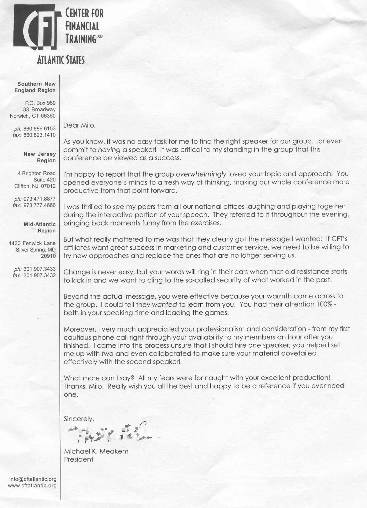 "A++! Milo, you are fantastic!! What a wonderful session. People often hate to do 'role-playing' and you made it fun. You have given me some great ideas and some fabulous tools to use. I DO sometimes find myself making absolutes about things in life. A great eye opener but without the 'slap'. Thank you!"