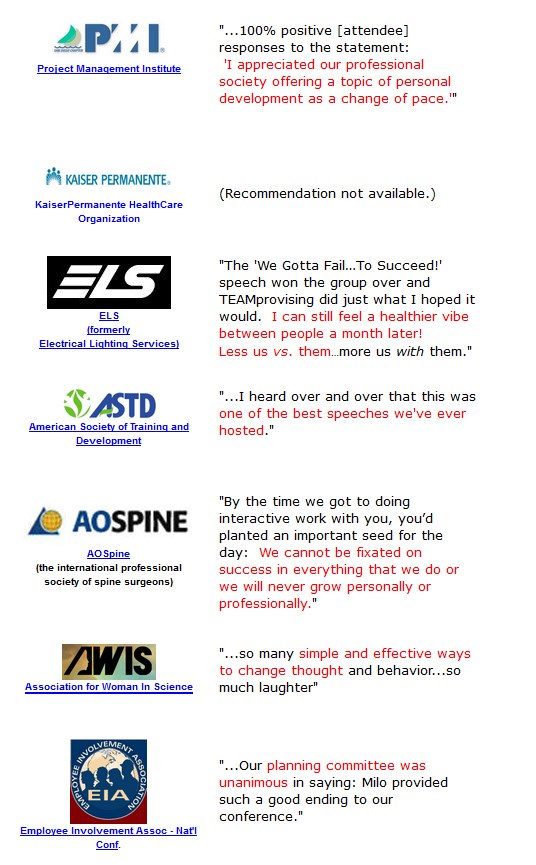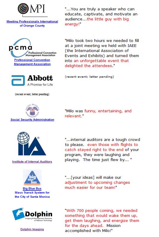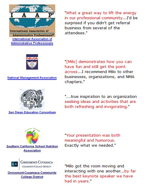 Public speaking skill coaching and presentation skills training in a fun and dynamic format. San Diego public speaking skills training with professional motivational speaker Milo Shapiro. Keynote speeches on public speaking and presentation skills by speaking coach Milo Shapiro via www.PublicDynamics.com. A fun and interactive way to improv your speaking skills with San Diego speech coach Milo Shapiro. Coaching in presentation skills and public speaking skills available. Centrally located to serve downtown, North County, East County, South Bay, La Jolla, Chula Vista, Del Mar, and more. Public speaking help with presentation skills training in a fun and dynamic format. San Diego executive speaking coach Milo Shapiro will make your program more powerful and captivating. The San Diego public speaking coach who will bring out your personal best while giving you solid fundamentals to draw from. Public speaking skills and presentation skills training in a fun and dynamic format. Los Angeles public speaking skills training with professional motivational speaker Milo Shapiro. A fun and interactive way to improv your speaking skills. Coaching in presentation skills and public speaking skills available. Keynote speeches on presentation skills and public speaking by speaking coach Milo Shapiro via www.PublicDynamics.com. Public speaking skills and presentation skills training in a fun and dynamic format. California public speaking skills training with professional motivational speaker Milo Shapiro. A fun and interactive way to improv your speaking skills. Coaching in presentation skills and public speaking skills available. Work on your fear of speaking in public with San Diego speaking coach Milo Shapiro. Get a San Diego speech coach to make you more dynamic, relaxed, and effective. San Diego speaking coach Milo Shapiro eases the fear of speaking with fun exercises and valuable feedback. Work on your stage fright with a speech coach like Milo Shapiro so you'll be confident. Public Dynamics: San Diego speech coach Milo Shapiro eases the fear of speaking with fun exercises and valuable feedback. Public speech and presentation skills training in a fun and dynamic format. San Diego public speech skill training with professional motivational speaker Milo Shapiro. A fun and interactive way to improv your speech skills. Coaching in presentation skills and public speech skills available. Public speech skills and presentation skills training in a fun and dynamic format. San Diego executive speech coach Milo Shapiro will make your program more powerful and captivating. Los Angeles public speech skills training with professional motivational speaker Milo Shapiro. A fun and interactive way to improv your speech skills. Coaching in presentation skills and public speech skills available. Public speech skills and presentation skills training in a fun and dynamic format. California public speech skills training with professional motivational speaker Milo Shapiro. A fun and interactive way to improv your speech skills. Coaching in presentation skills and public speech skills available. Work on your fear of speaking in public with San Diego speech coach Milo Shapiro. Get a San Diego speech coach to make you more dynamic, relaxed, and effective. Work on your stage fright with a speech coach like Milo Shapiro so you'll be confident. Milo Shapiro is also a motivational public speaker with presentations on risk-taking and on public speaking skills.