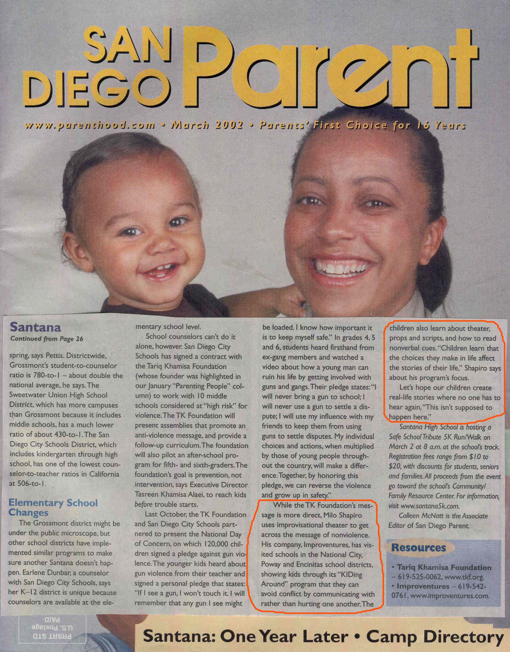 While the TK Foundation's message is more direct, Milo Shapiro uses improvisational theatre to get across the message of nonviolence. His company, IMPROVentures, has visited schools in the National City, Poway, and Encinitas school districts, showing kids through its "KIDding Around" program that they can avoid conflict by communication with rather than hurting one another.